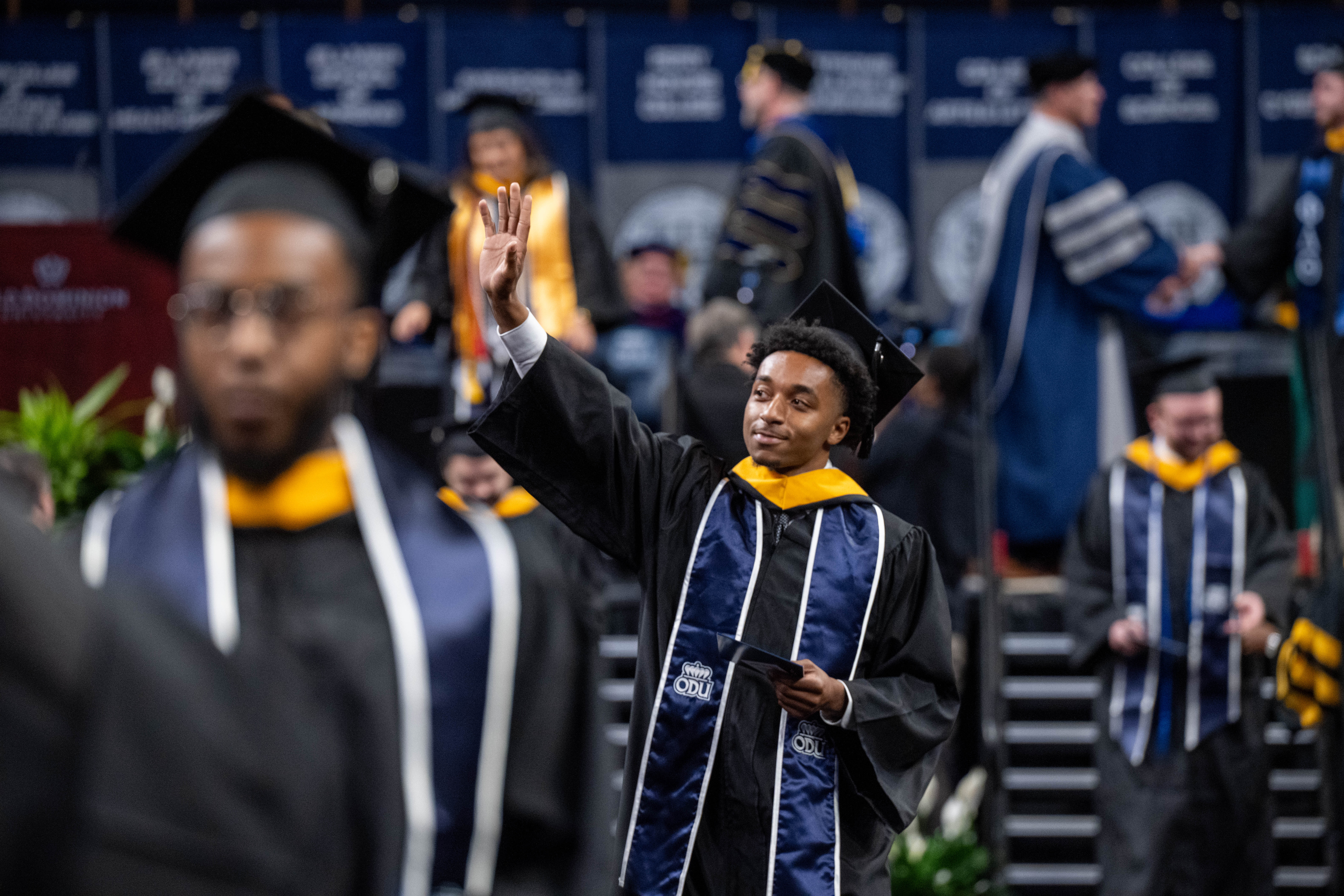 The first ceremony, held at 9 a.m. in Chartway Arena, celebrated graduates from the Batten College of Engineering and Technology, College of Arts and Letters, College of Sciences, School of Cybersecurity, School of Data Science and the School of Supply Chain, Logistics and Maritime Operations.