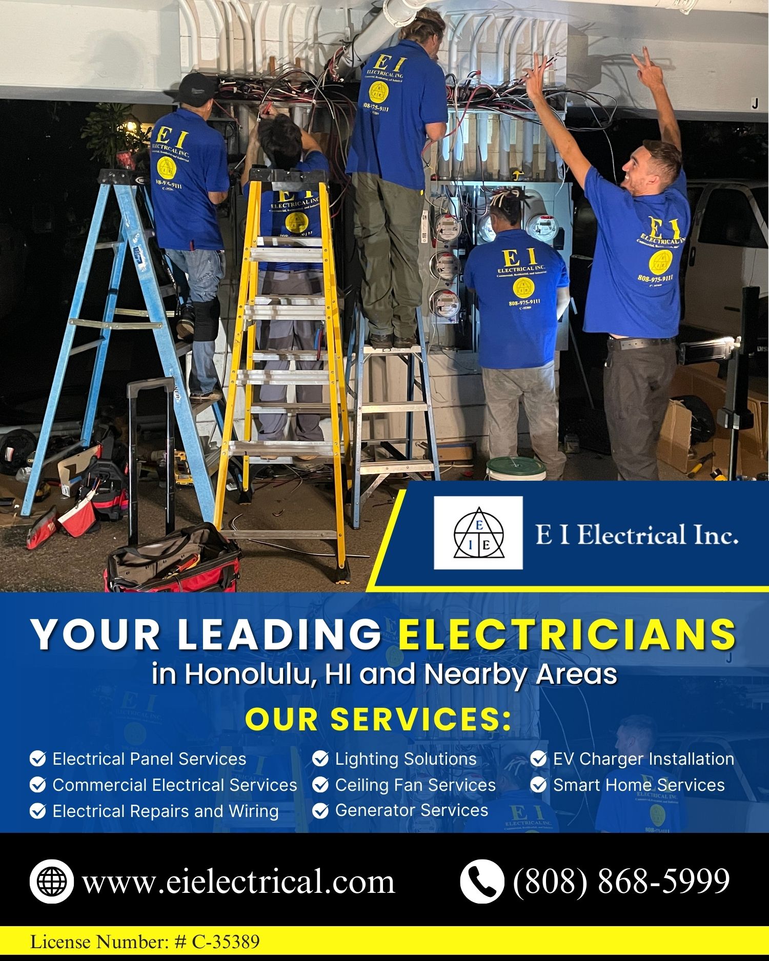 HONOLULU, HI, UNITED STATES, October 14, 2025 /EINPresswire.com/ -- E I Electrical Inc. (License #CT-35389) continues to build momentum in the electrical service industry across Hawaii through recent certifications, new hiring initiatives, and a key partnership with KM Electrical Services. These updates reflect the company’s commitment to maintaining verified service quality, increasing workforce capacity, and expanding project reach. Each advancement supports continued growth across residential, commercial, and industrial sectors.