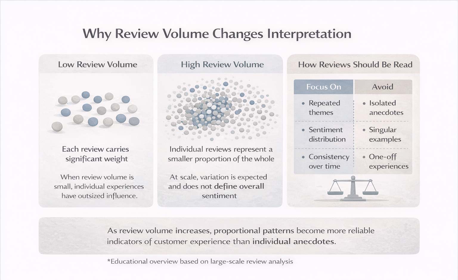 When reviews are interpreted proportionally, high-volume datasets provide stronger, not weaker, insight into customer experience.
